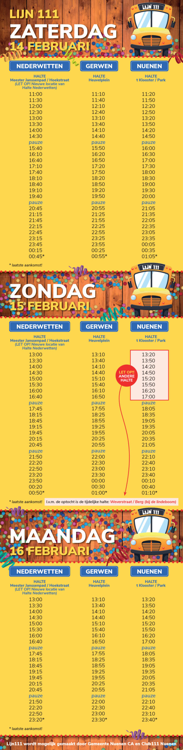 Lijn 111 aangepaste haltetijden Date 11 februari 2026 Lijn 111 rijdt gelukkig weer, wederom dankzij de steun van Club 111, gemeente Nuenen c.a. en de gezamenlijke carnavalsverenigingen. Hieronder de haltetijden. Haltetijden 2026 Lijn 111